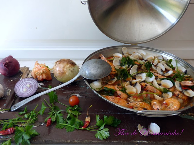 Então hoje a sugestão que vos trago é esta maravilhosa cataplana de peixe e marisco, com cheiro a mar e verão! Um prato que faz lembrar as ferias, quando passadas numa zona de mar. De preferência numa vila piscatória com um mercado de peixe, onde todos os dias bem cedinho chegam os barcos, depois de uma madrugada de faina com o pescado. Adoro aquele frenesim da chegada dos barcos, as mulheres ali a conversa umas com as outras enquanto esperam os maridos chegarem com o barcos, as gaivotas também sabem que vai ter uma refeição grátis. Os turistas ali a volta atrapalhar com câmara fotográfica e telemóveis em punho, prontos a registar tudo. É verdade que só atrapalham o trabalho dos pescadores. As manobras dos tractores que tem que entrar na praia para, que com seu mecanismo hidráulico puxem as redes carregadas de peixe, vi-vinhos a saltar ainda na rede, a variedade de peixes que aquelas redes trazem, só visto mesmo. Ali mesmo o peixe é separado por espécie e tamanho, colocado em tabuleiros, balseiros e dali vai directo para lota.